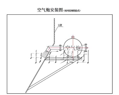 因空氣炮用到鋼結(jié)構(gòu)倉上,炮體小、重量輕,可采用吊掛式,與炮口形成三點定面的穩(wěn)固結(jié)構(gòu)。空氣炮倉內(nèi)的噴嘴也是安裝注意的要點,掌握不好,達(dá)不到應(yīng)有的效果。安裝時,應(yīng)讓噴嘴下唇近貼內(nèi)倉壁,使噴出的氣流順藏椎體內(nèi)壁噴發(fā),破處物料支點。